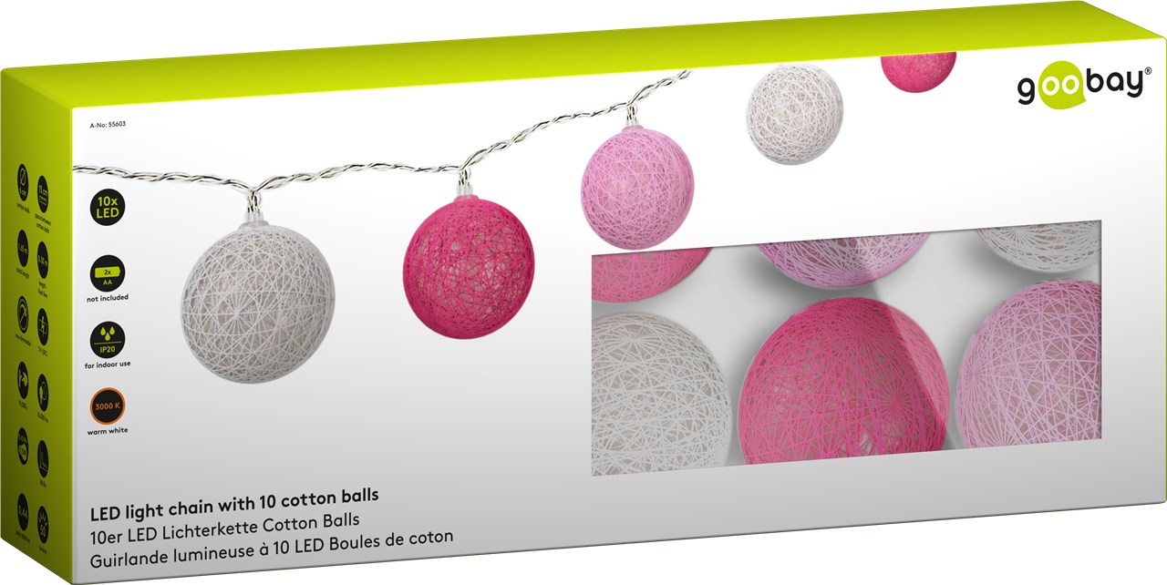 - Lichterkette mit 10 warm-weißen LED Cotton Balls (Ø je 6 cm) in Weiß, Rosa und Pink