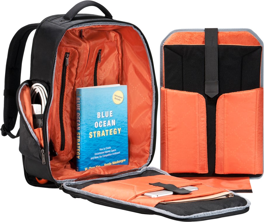| Fächer für | A4-Ordner, Computer-Zubehör, Geldbörse, Getränkeflasche, Kopfhörer, Kreditkarten, Mediaplayer, Netzteil, Laptop, Reiseunterlagen, Smartphone, Stifte, Tablet/eReader, Visitenkarten, Zeitschriften |