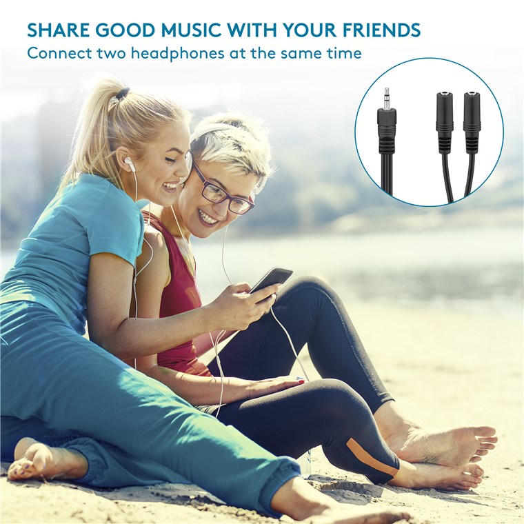 - Der Adapter splittet das Audio-Signal eines Gerätes auf zwei separate Ausgänge (Anschlüsse) die mit je einem Kopfhörer genutzt werden können.