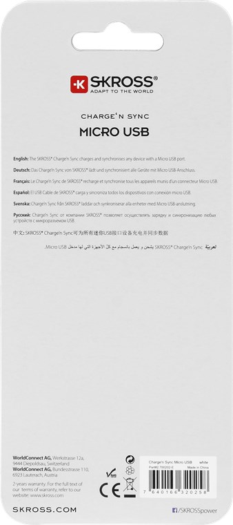 Das SKROSS® Charge‘n Sync Micro USB Kabel bietet eine schnelle Verbindung, um all Ihre Micro USB Geräte zu laden und zu synchronisieren.