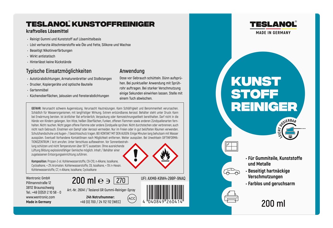 - Reinigt Gummi und Kunststoff auf Lösemittelbasis