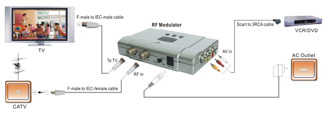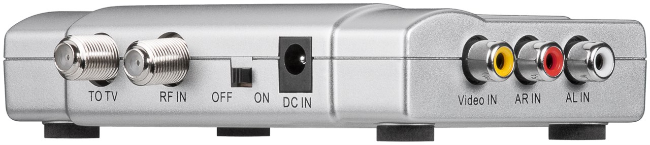 - przekształca sygnały obrazu i dźwięku (stereo) z nagrywarek DVD, kamer cyfrowych na sygnały o wysokiej częstotliwości (VHF/UHF)