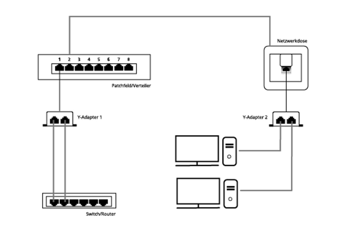 Rozgałęźnik umożliwia poprowadzenie dwóch przewodów Ethernet za pomocą jednego kabla CAT (cable-sharing). Jest to możliwe, ponieważ połowa przewodów w kablu sieciowym jest nieużywana. Rozgałęźnik nie wymaga zasilania elektrycznego, musi być jednak zawsze stosowany parami – po jednym na każdym końcu przewodu. Pierwszy rozgałęźnik łączy sygnały, a drugi ponownie je rozdziela na zwykłe gniazda sieciowe. Działa to tylko wtedy, gdy nie używa się sieci LAN Gigabit i PoE. W przeciwnym razie używanych jest więcej przewodów i nie jest możliwe użycie rozgałęźnika.