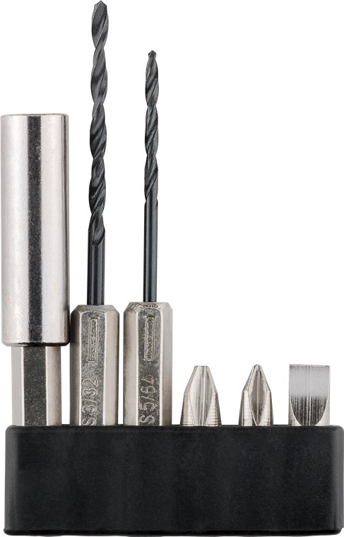 - inkl. 3x 25 mm CRV Bitsatz, 1x Bitverlängerung, 2x Bohrer 5/64 (2 mm), 3/32 (2,5 mm) und 1x Netzteil