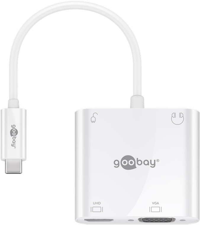 erweitert ein USB-C™-Gerät um einen HDMI™- , einen 3.5 mm Audio- und einen VGA-Anschluss