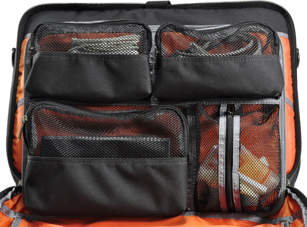 | Fächer für | A4-Ordner, Computer-Zubehör, Geldbörse, Kopfhörer, Kreditkarten, Mediaplayer, Netzteil, Laptop, Reiseunterlagen, Smartphone, Stifte, Tablet/eReader, Zeitschriften, Visitenkarten |