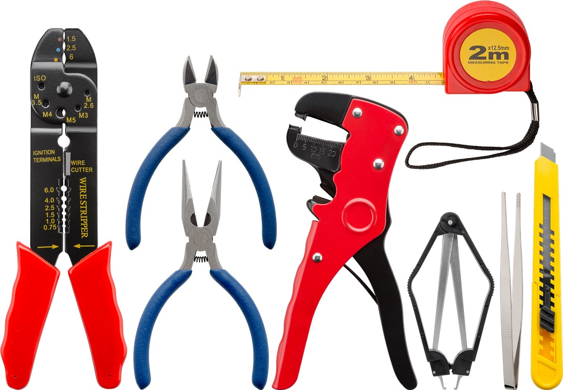 - 1x Crimpzange, 1x Abisolierzange, 1x Maßband