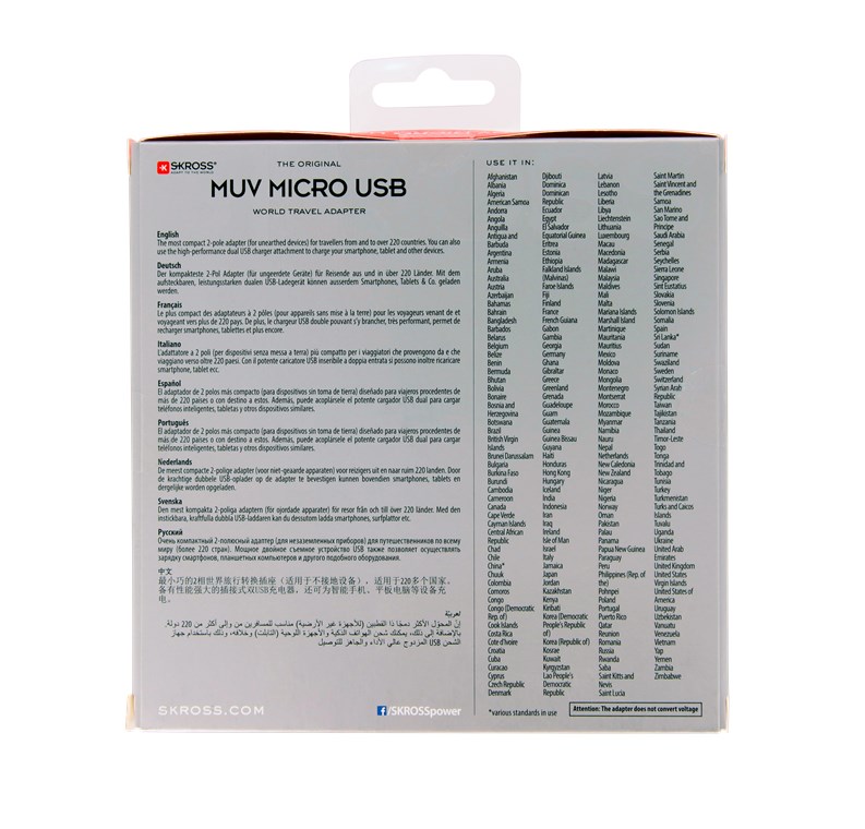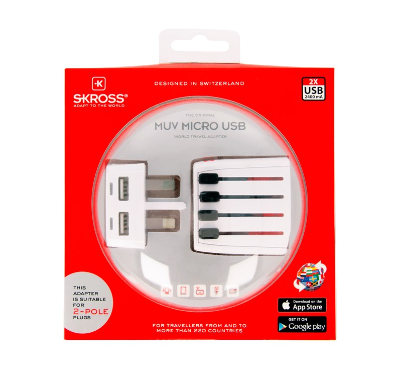 Der kompakte World Adapter MUV Micro USB bietet Reisenden aus aller Welt einfachen Anschluss aller ungeerdeten 2-pol. Geräte.